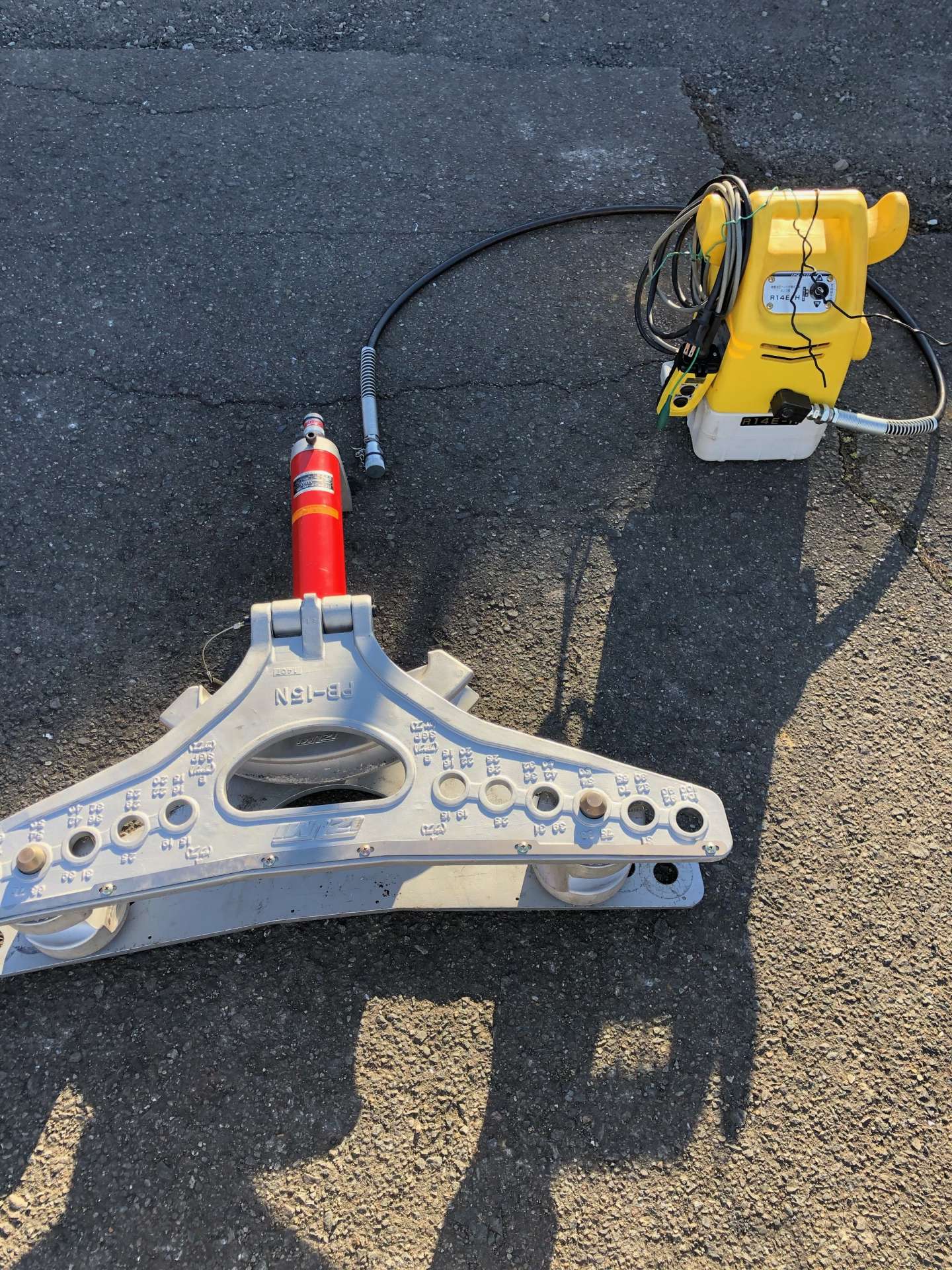 今回は油圧式パイプベンダ。前回のねじ切り機同様、中々出番がない道具ですが、これがまたあると便利な道具なんです。これはわかりやすい、パイプを曲げる道具。ではなぜ真っ直ぐのパイプをわざわざ曲げてしまうのか。真っ直ぐ配管できる現場であれば出番は全くないのですが障害物などがあると避けて配管しなければならない・・・そんなときに活躍するのがこのパイプベンダです。この油圧式のタイプは主に太いパイプを曲げる時に使います。細いパイプを曲げる時にはまた別の、手で持って曲げるベンダがありますがそれはまた機会があれば載せようと思います。手で持って曲げられる・・・これはまた私も使ってみたい道具なので気になります。