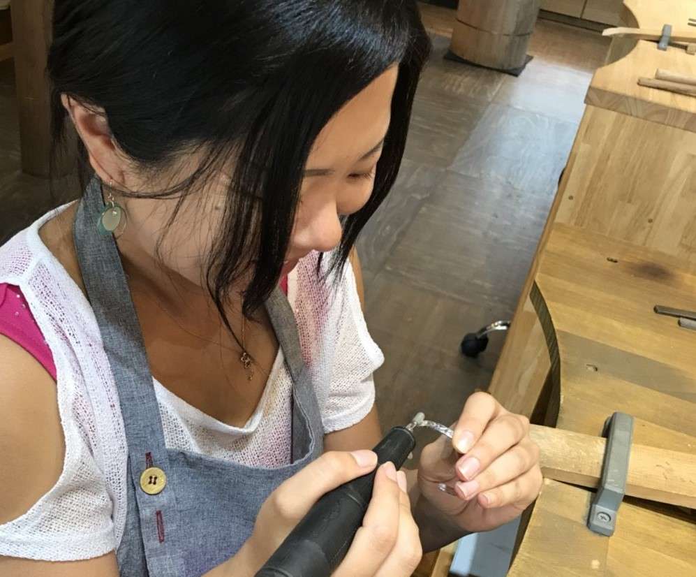 物作りと一言で言ってもその種類は多岐にわたります。今回は何でも「作る」ことが大好きな私が鎌倉で体験してきた銀細工のお話です。このお店では銀で指輪かブレスレットのどちらかが作れるということなのでブレスレットを作ってきました。テープ状に巻かれた銀を必要な長さでカットしてもらい、自分で刻印を入れて磨くという体験、とても楽しかったです♪写真は最後の磨きあげをしている所ですね。刻印には様々な種類があり、イラストや文字を選んでハンマーで叩いて刻むというものでした。細かい作業な上、力も必要だったので細い金属をずれないように固定をして叩くというのは想像より難しく、何カ所か失敗してしまいました。が、自分で作った物なので愛着もあり、7、8年経った今でも気に入って使っています♪事務職の私ですが、物作りが本当に好きなので本当は職人に向いているのかもしれません(笑)。