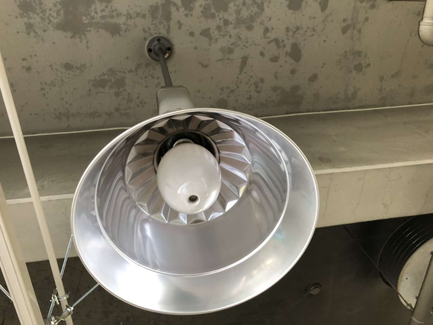学校などもそうですが、工場も仕事を止めていただくわけにはいかないのでお客様と綿密に日程調整をし少しずつ進めていきました。工場内を暗くすると車の整備ができなくなってしまうので、既存の水銀灯を点けた状態での作業・・・水銀灯の照明器具は熱くなるため、近くでの作業は大変です。