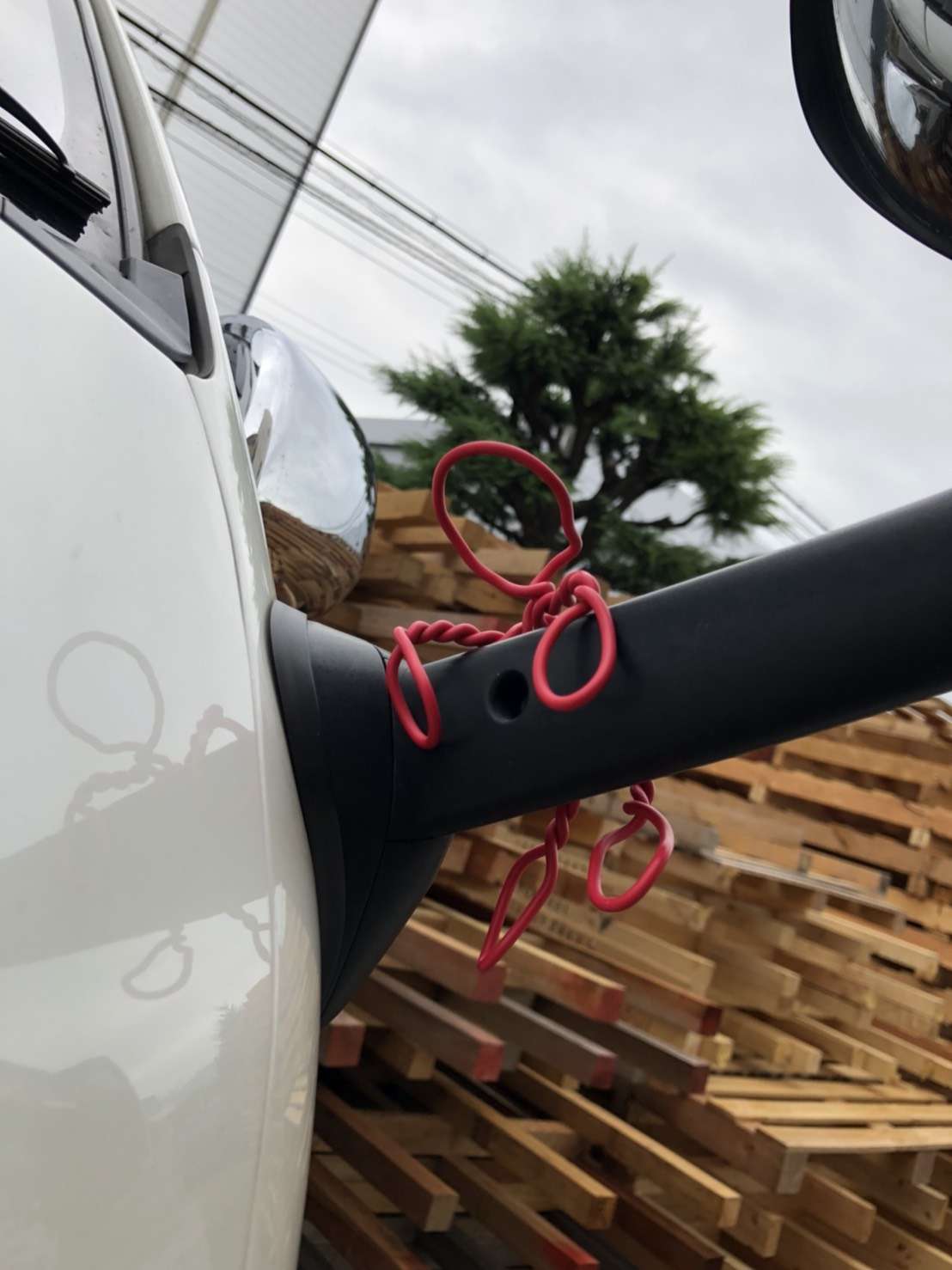 これぞ大人の男の暇つぶし!余った電線を使って素手でささっと作った「電線くん」!どこぞの現場の待ち時間で作ったらしい電線くん。かわいいし、器用だなぁと思ってよくよく見てみると・・・ん?この車って弊社の車ではないような・・・。1枚目の写真、奥に写っているのが弊社の車では?アップにして見てみたらやはりリアガラスに弊社のロゴマークが!ということで、送られてきたこの写真を社長に見てもらって確認すると、先日仲の良い協力会社さんの現場を手伝った時のものではないかということでした。こんなことをさせてくれるほど仲のいい方が他社にいらっしゃる心強さ・・・☆