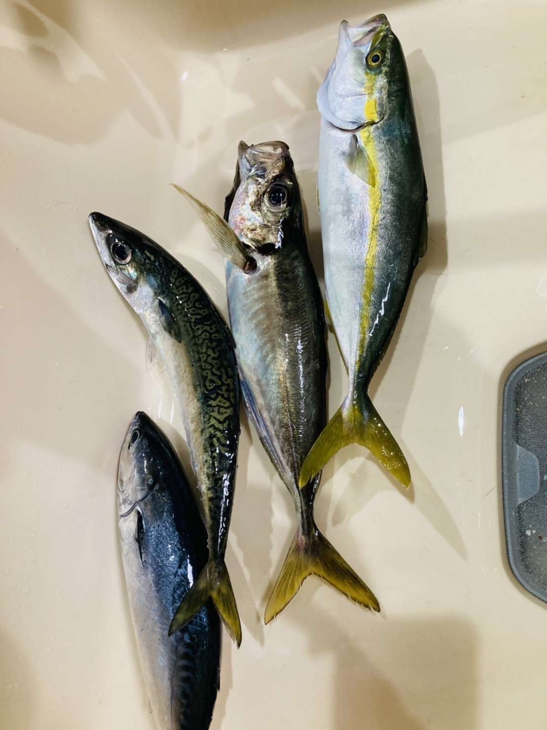 仕事をふってくれている方や協力会社さん、同じ現場に入った空調屋さんなど普段職場以外では中々会うこともないメンバーでとても楽しかったそうですよ☆写真2枚目の右からイナダ、鰺、鯖、鰹と、多種類の魚が釣れて大満足!本当は鰺狙いだったそうですが鯖が爆釣(笑)。彼は鯖が好物らしくとっても嬉しかったそうですが、鰺を期待していた私は少し落ち込みました。が、脂ののった鯖のおいしいこと♪写真は魚の種類を・・・と、撮ってもらったもので4匹しか写っていませんがかなりの数の鯖だったそうです。おかげさまでスーパーではあまり見かけない立派なサイズの鯖を数匹分けていただきました♪鯖は味噌煮と竜田揚げになりました。少なかったはずの鰺もいただいてしまい、おいしいなめろうになりました♪