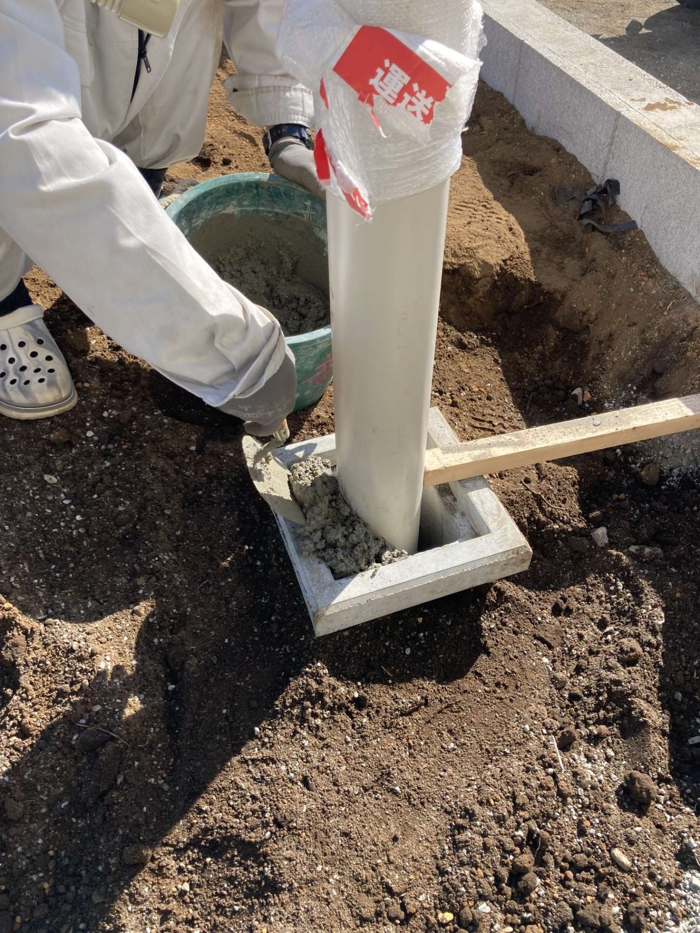 穴を1m堀り、そこに引き込み用ポールを立ててそこから埋設配管をします。住宅までの電線を配管の中に通します。最近では木枯らしが吹いたり、これからの季節は春一番が吹きますよね。強風の多い日本でも事故が起こらないよう、ポールの根元に転倒防止のコンクリートを打ちました。