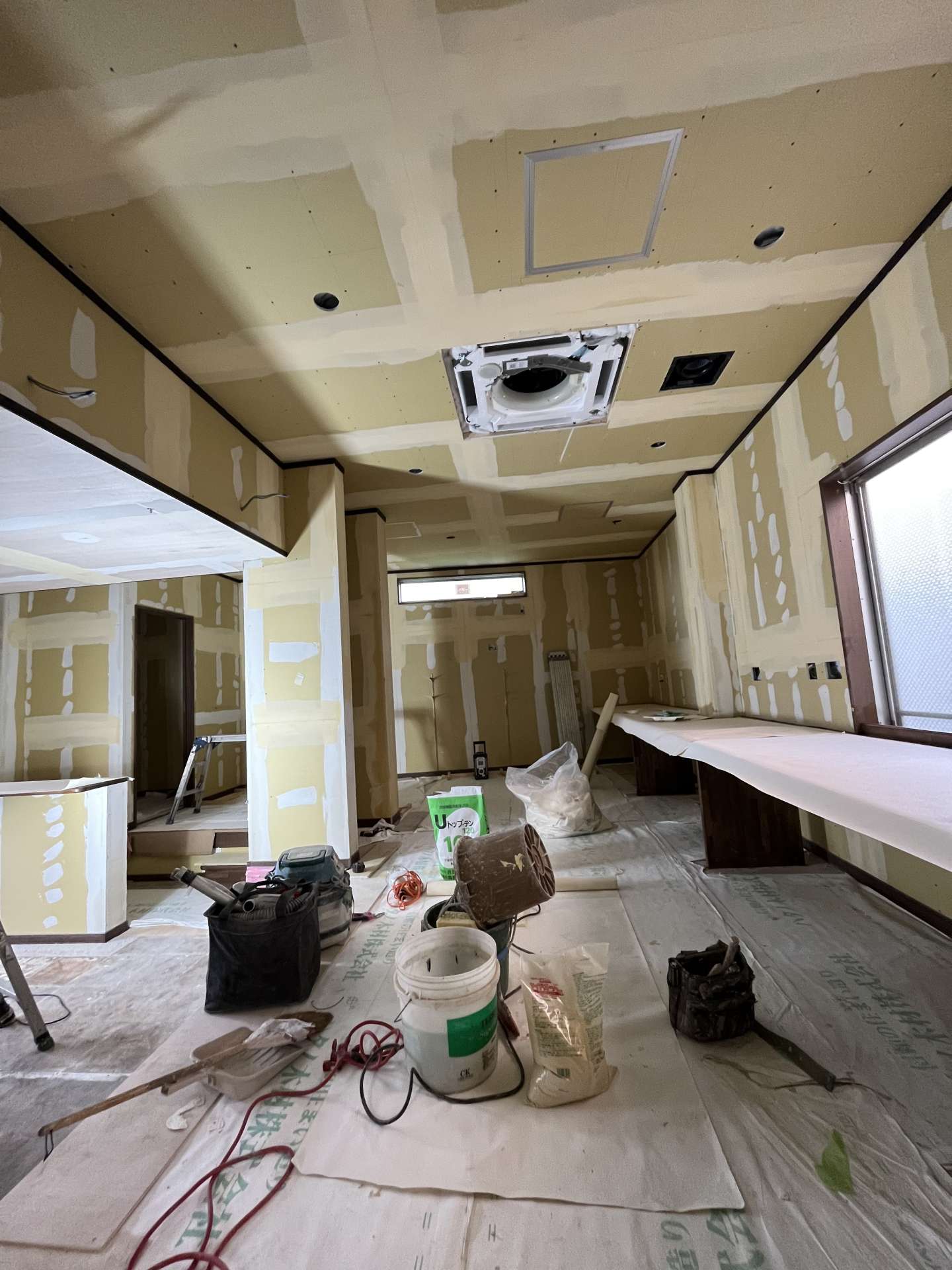 倉庫増築8 2022/05/30 壁紙の下処理 ボード開口したら次はクロス(壁紙)の下処理をします。パテという粉と水を混ぜたものでボードとボードの繋ぎ目や、ボードを貼ったときのビス頭を埋めていきます。これをしっかりやらないと仕上がった壁紙が浮いてきてしまうので、これもまた大切な作業。地味な作業にも全てちゃんとした理由があるんですよね。 ハタノ木材の監督:林さんと意見を出し合いクロスと床を決めていきます。本気で相談できる仲間が社外にいてくださる、とてもいいことですよね♪