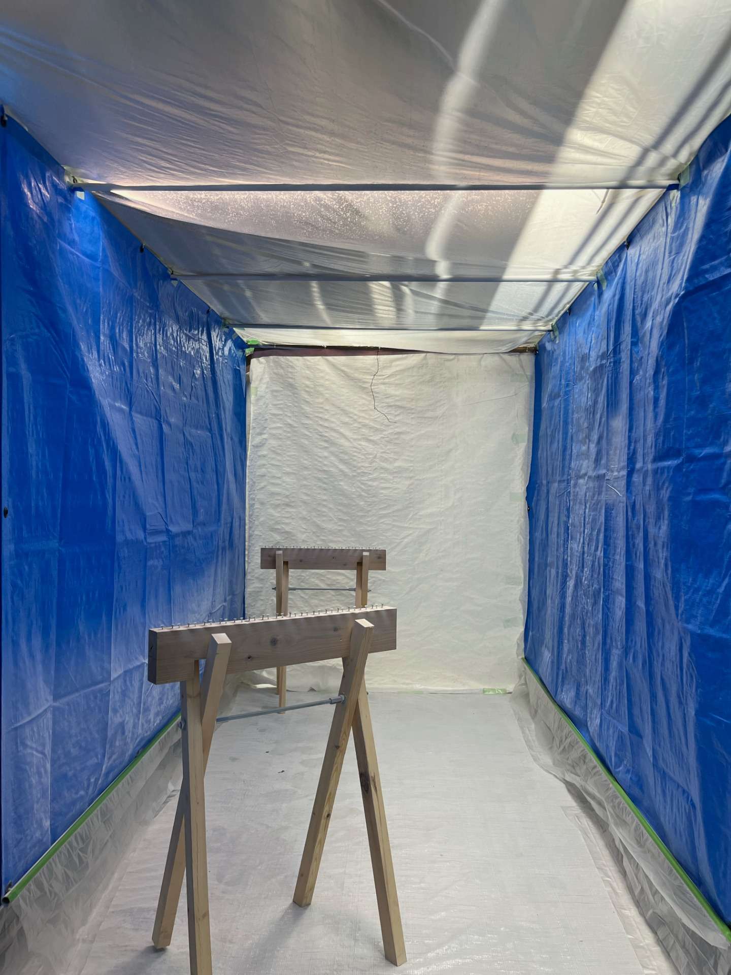 今回は赤坂にある現場で使う材料を塗装するために倉庫内にペンキブース設置!・・・と言ってもブルーシートと養生シートで作った簡易的なものなんですけどね。今まではこういう時にはハケやローラーを使って塗っていたのですが、今回は社長の提案でエアーコンプレッサーを使ってスプレーガンとして塗っていきます。下塗りのプライマーを塗って、仕上げを2回・・・計3回塗りました。これでうまくいけば今後はスプレーガンで時間短縮に成功します♪