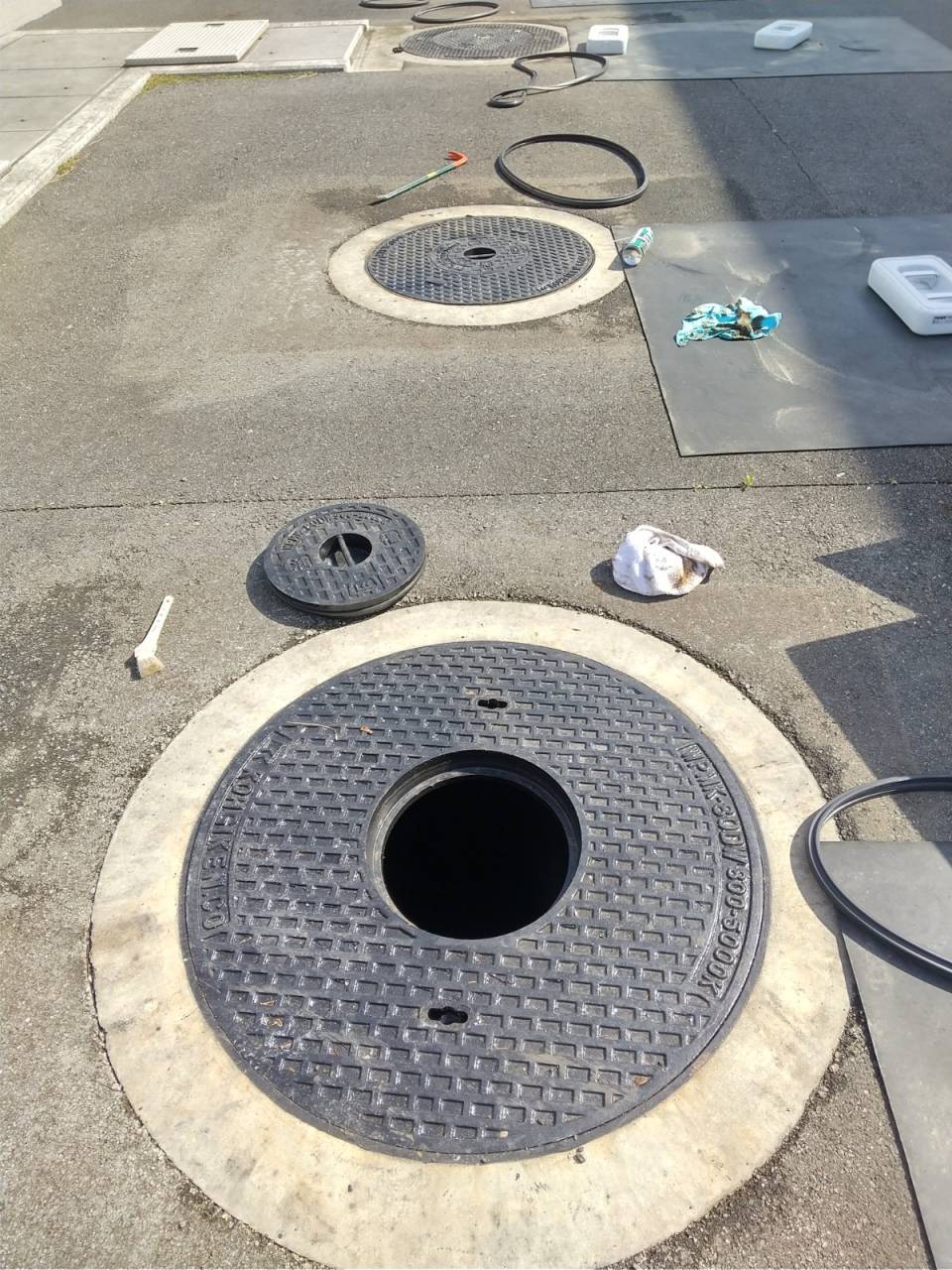 非常用発電機とは建屋の電気が災害など何らかの原因で停電が起きてしまった場合に切り替わり、建屋内の機器に電気を送るためのものです。今回のは埼玉県内にある放送局だったのですが、万一県内で停電が起きても放送を続けるための重要な設備でした。大きな災害などがあった場合でも放送ができるよう、建屋外に何百リットルも入るオイルタンクを埋設してあります。この点検用蓋の隙間から水などが入らないよう定期的に交換しているんですね。実は今回は2度目だったりします(笑)。電気屋ですけどね(笑)。