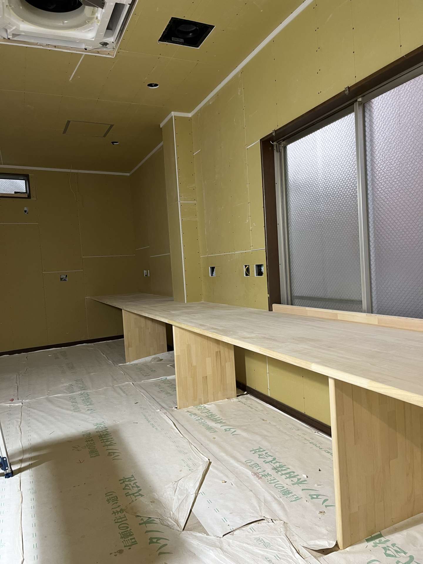 倉庫事務所の増築も順調に進み、壁と天井のボードが貼り終わりました。電気屋としてのボード開口も終わり、あとはクロス(壁紙)を貼ってもらうと壁&天井は仕上がります♪ちなみにボード開口とはコンセン…