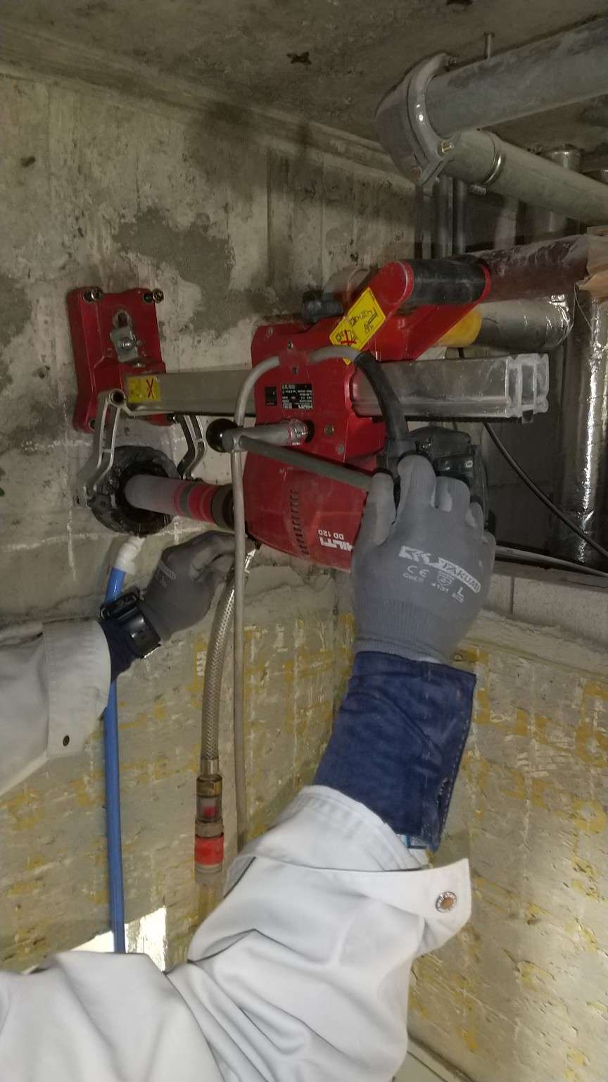 先日から続いている神奈川県立高校での工事です。今回は1枚目の写真にある工具、コンクリートコアドリルの紹介です。新築工事の場合は元々電線を通す為のルートが確保されているのですが、今回のような改…