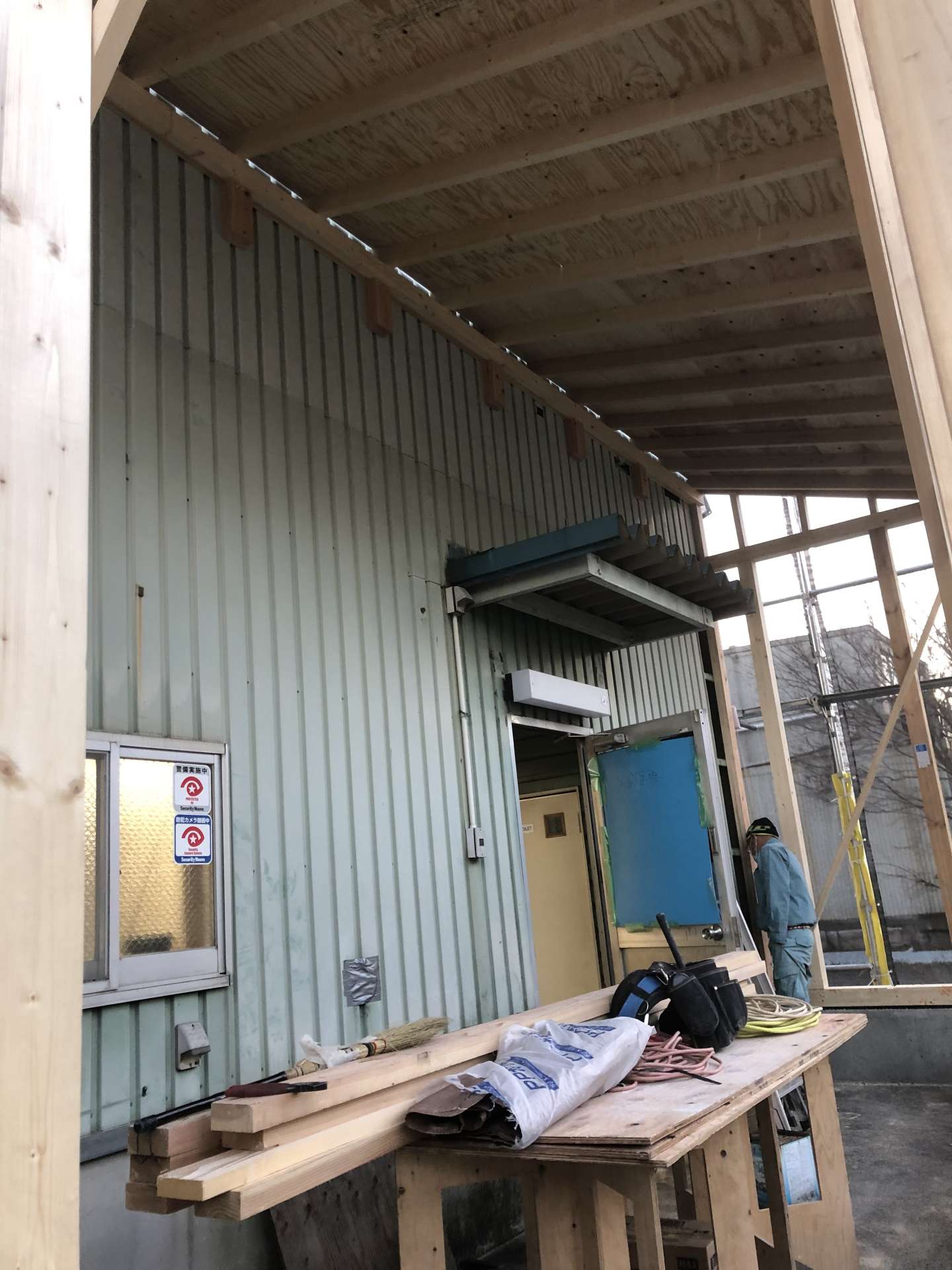 引き続き倉庫の事務所増築です。今回は外壁と屋根の下地工事の様子です。前回紹介した骨組みにベニヤ板などを貼って下地を作ります。こうなると中の広さもより分かりやすくなってきますね♪日に日に完成が…