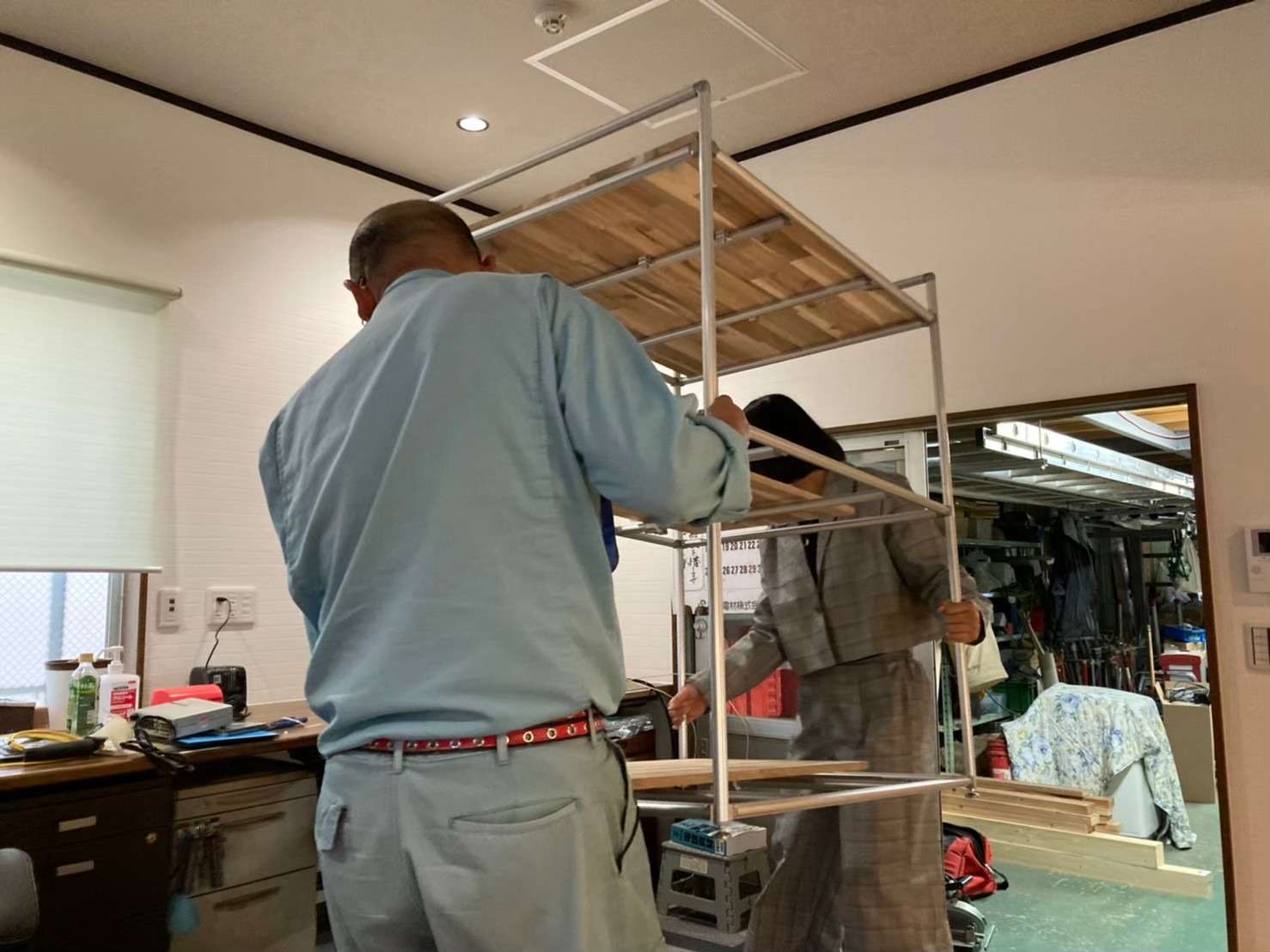 倉庫の増築に伴い、事務所内の整理もかなり行われました。その中で出てきた細々したものの収納に困った社長。折角キレイに造り替えるのだから半端な収納にしたくない。ということで棚も手作りでやっちゃ…
